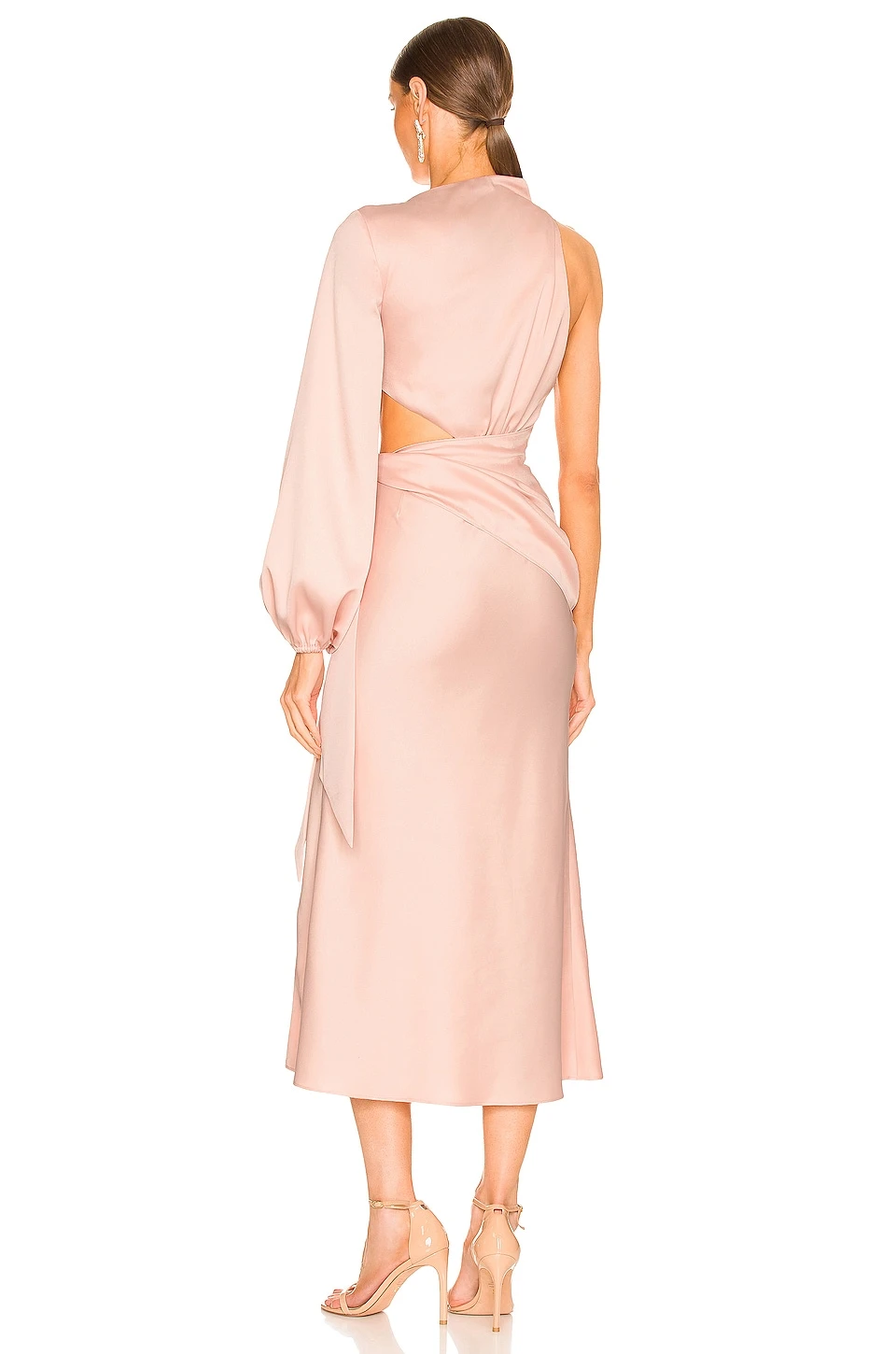 One shoulder styling with blouson sleeve and elastic cuff - Side cut-out with attached waist tie