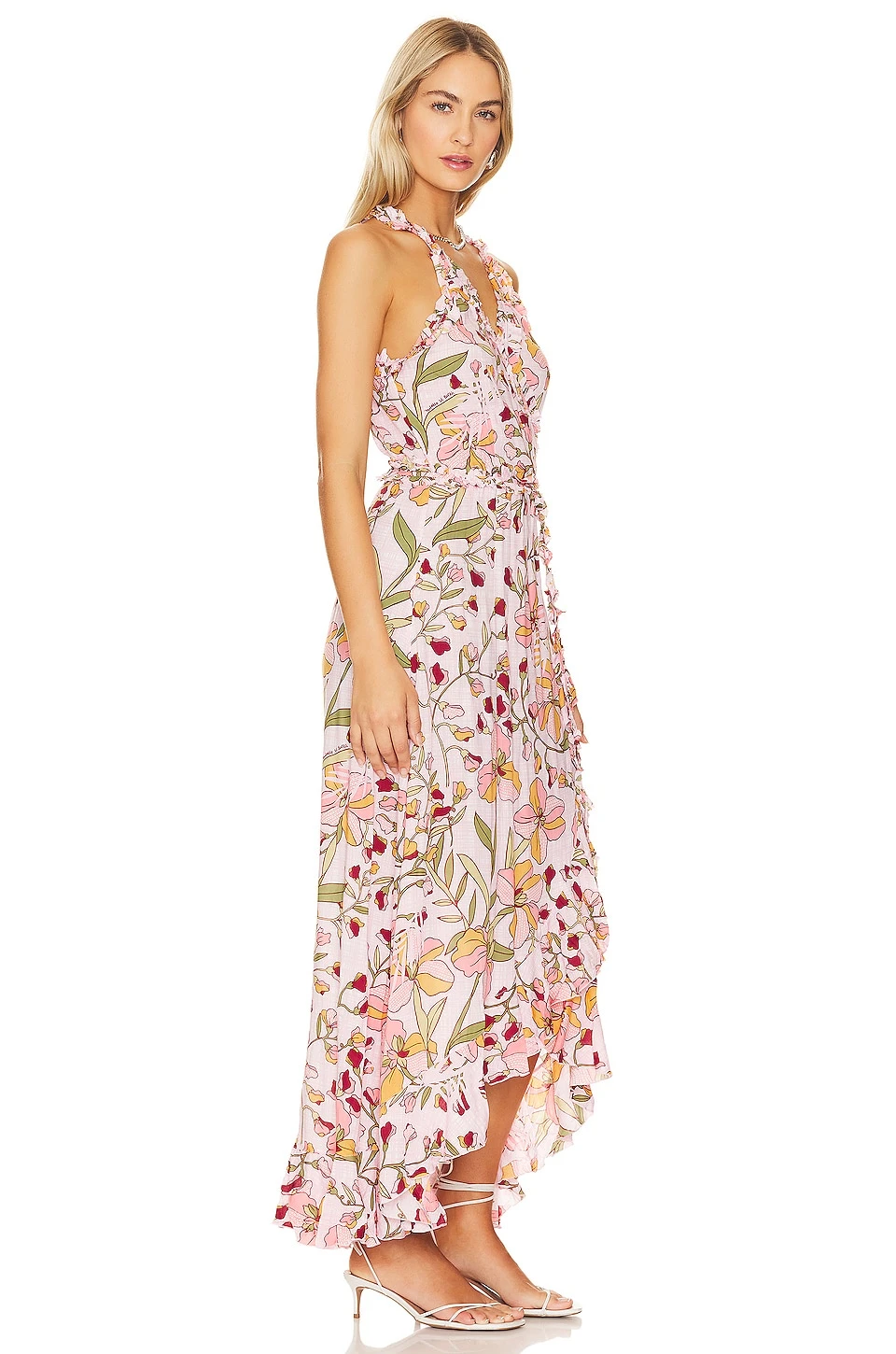 - Lightweight voile fabric with ruffle trim and hi-low hem